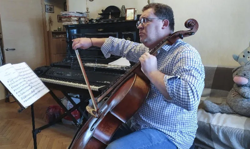 العازف الرئيسي في أوركسترا مسرح البولشوي بوريس ليفانوفسكي يتدرب في منزله بموسكو (أ.ب)