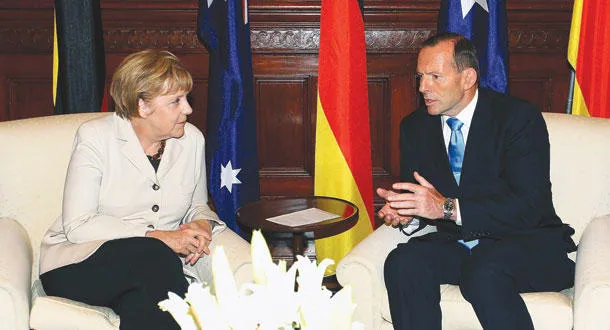المستشارة الألمانية أنجيلا ميركل ورئيس الوزراء الأسترالي توني أبوت خلال أحد اجتماعات قمة العشرين (إ.ب.أ)