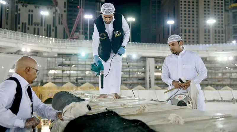 جانب من تعقيم الكعبة المشرفة أول من أمس (رويترز)