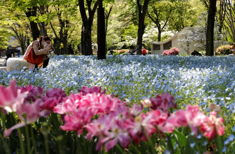 يابانية تضع كمّامة تصوّر الزهور المتفتحة في حديقة عامة بطوكيو (رويترز)