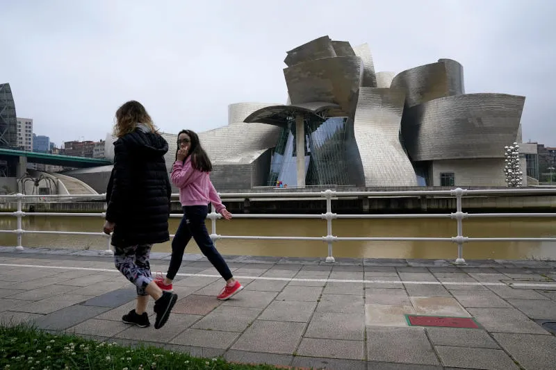 عائلة تمر بالقرب من متحف غوغنهايم بعد رفع القيود جزئياً عن الأطفال لأول مرة منذ ستة أسابيع في إسبانيا (رويترز)