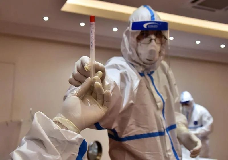أحد أفراد الطاقم الطبي في لبنان يحمل اختباراً للدم (أ.ف.ب)