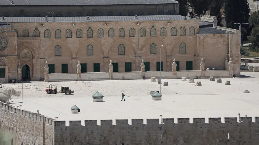 باحات المسجد الأقصى خالية من المصلين أمس في الجمعة الثانية من شهر رمضان في ظل إجراءات الوقاية من انتشار وباء «كورونا» (إ.ب.أ)