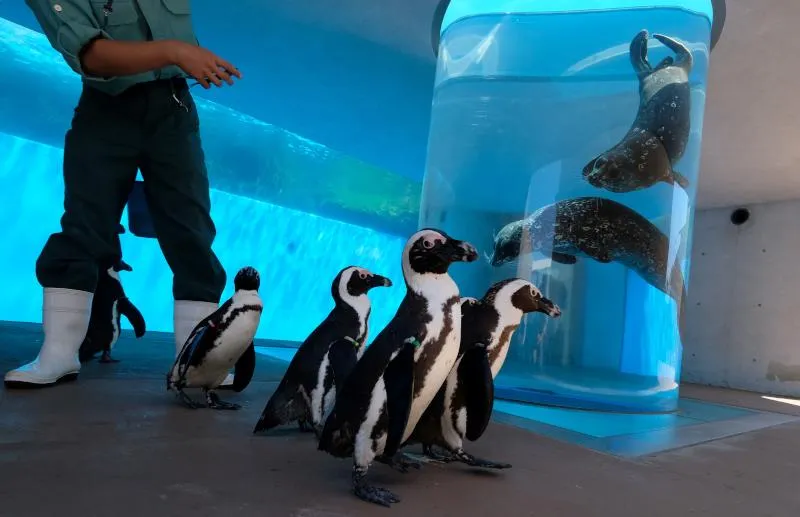 فقد أتيحت لمجموعة من البطاريق في متنزه يوكوهوما هاكيجيما المائي قرب طوكيو فرصة التوقف أمام حوض الفقمة للتعرف إلى هذه الحيوانات للمرة الأولى، وذلك بعدما دُفعت لسلوك مسار مختلف في هذا الموقع الذي تتنقل في أقسامه عادة لنحو عشرين دقيقة.