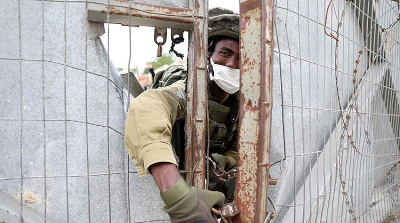 جنود إسرائيليون يفتحون قفل بوابة في الخليل بالضفة للسماح بمرور مستوطنين (إ.ب.أ)