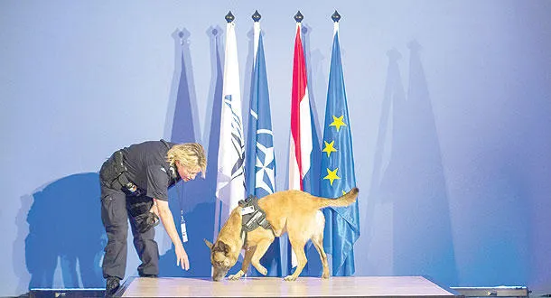 ضابطة شرطة هولندية تستعين بكلب مدرب أمس لضمان أمن جلسات الجمعية البرلمانية لحلف شمال الأطلسي المنعقدة حالياً في لاهاي التي تبحث خصوصا الأزمة الأوكرانية (إ.ب.أ)