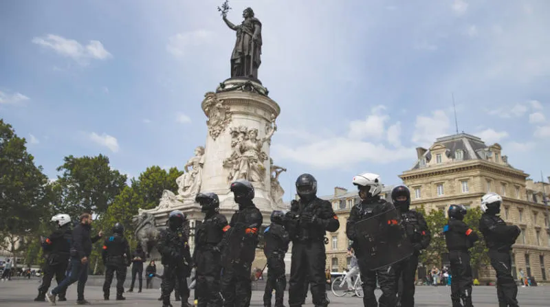 عناصر من الشرطة الفرنسية في ميدان الجمهورية بباريس إثر تفريق تجمع ضم أكثر من 10 أشخاص أمس (إ.ب.أ)