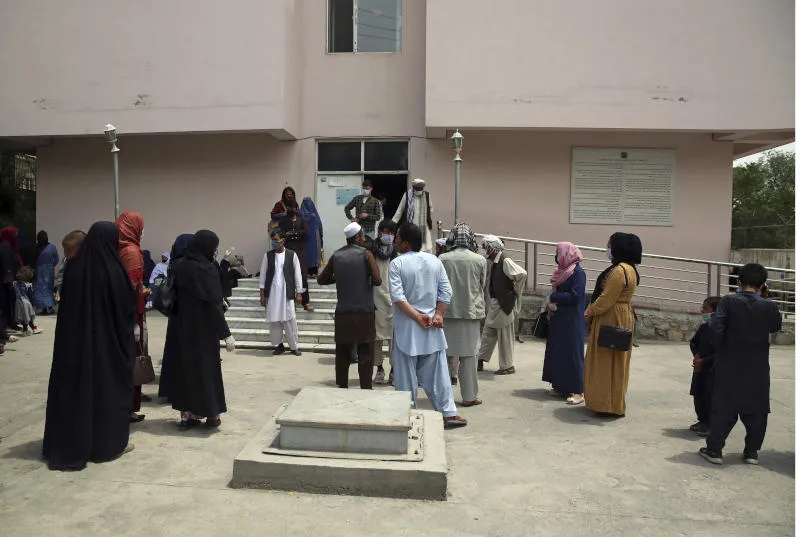 أفراد من عائلات أطفال حديثي الولادة ينتظرون خارج مستشفى التوليد الذي تعرّض لتفجير في كابل (أ.ب)