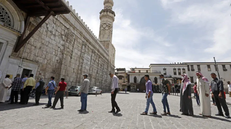 مصلون يرتدي بعضهم كمامات واقية من «كورونا» يقفون في طابور لدخول الجامع الأموي بدمشق أمس (أ.ف.ب)