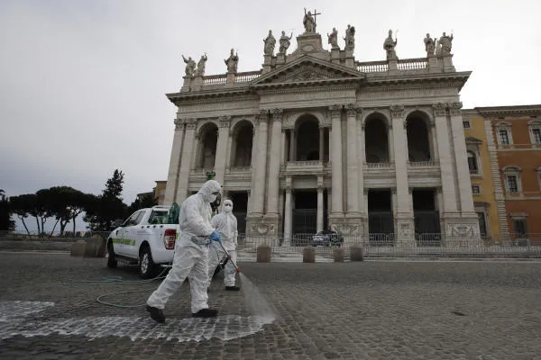 تعقيم باحة كاتدرائية القديس يوحنا في روما يوم أمس الجمعة (ا.ب)