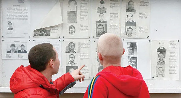 شابان يقفان أمام لائحة تضم معلومات عن أشخاص مطلوبين في بلدة أدلر التابعة لمدينة سوتشي بجنوب روسيا أمس (رويترز)