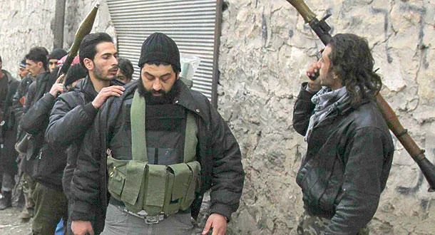 مقاتلون من الجبهة الإسلامية لدى تجمعهم بأسلحتهم إثر هجوم شنته ضدهم قوات تابعة للنظام السوري في قرية العزيزية بحلب أمس (رويترز)