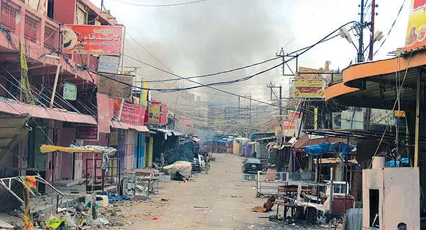 سوق جلولاء يبدو مهجورا وتبدو أعمدة الدخان تتصاعد أمس غداة استعادة البيشمركة السيطرة على الناحية من «داعش» («الشرق الأوسط»)
