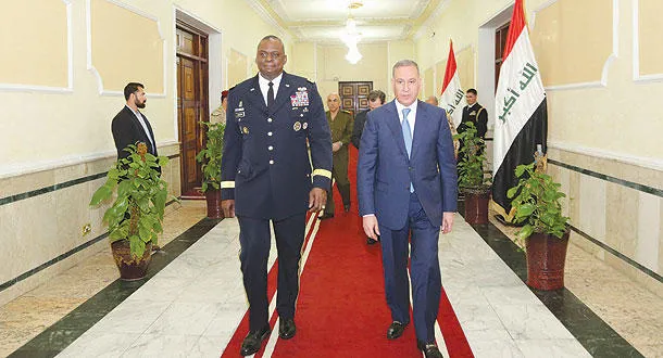 وزير الدفاع العراقي خالد العبيدي لدى استقباله قائد القيادة المركزية الأميركية الجنرال لويد أوستن في مقر الوزارة ببغداد أمس (رويترز)