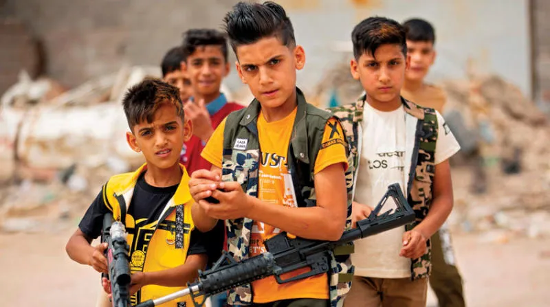 فتية عراقيون يلهون ببنادق بلاستيكية خلال احتفالهم بعيد الفطر في البصرة جنوب العراق أمس (أ.ف.ب)