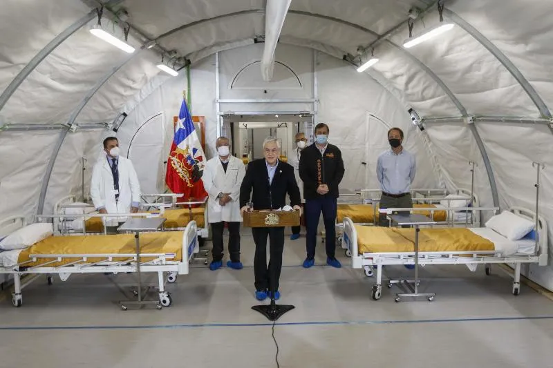 الرئيس التشيلي سيباستيان بينييرا يلقي خطاباً من قسم مخصص لعلاج مرضى كورونا في أحد مستشفيات البلاد (د.ب.أ)