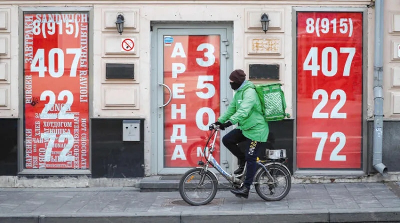 عامل توصيل طلبات يمر أمام مطعم مغلق في موسكو أمس (إ.ب.أ)