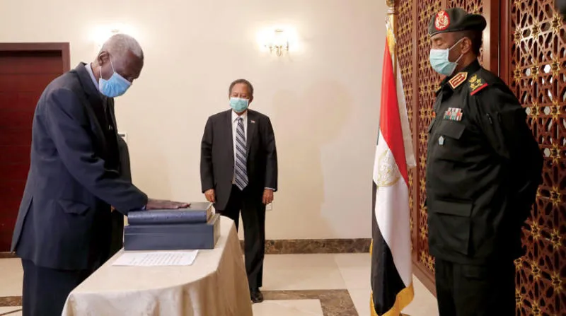وزير الدفاع السوداني الجديد يؤدي اليمين الدستورية أمام البرهان وحمدوك في الخرطوم أمس (أ.ب)