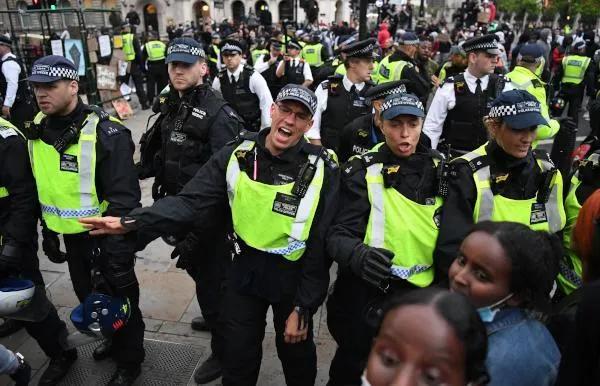 أفراد من الشرطة البريطانية خلال تأمين مظاهرة مناهضة للعنصرية في لندن (ا.ف.ب)
