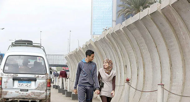 مصريان يمشيان بجانب حاجز خرساني يحيط بوزارة الخارجية في القاهرة أمس (أ.ف.ب)