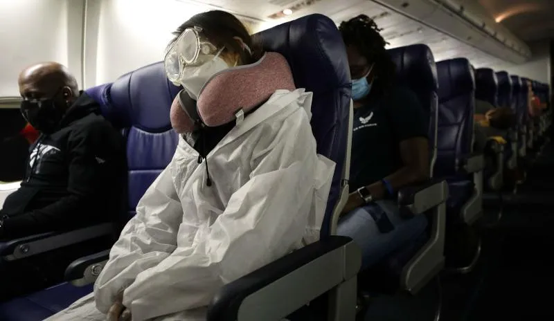 راكب يرتدي بدلة حماية كاملة خلال رحلة طيران لخطوط «ساوث ويست» الجوية من لوس أنجليس إلى هيوستن (أ.ف.ب)