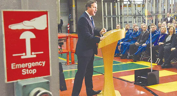 كاميرون لدى إلقاء خطابه في مقر الشركة المصنعة لحفارات «جي سي بي» بمدينة روشستر الواقعة وسط إنجلترا أمس (رويترز)