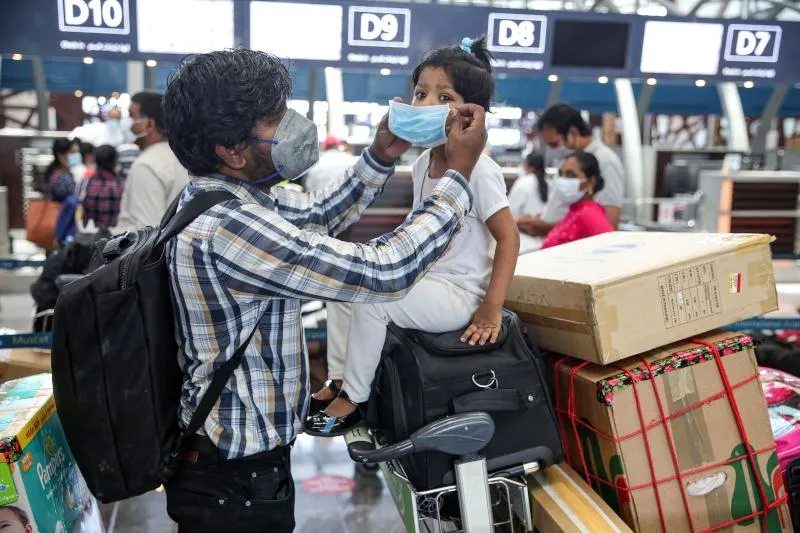 أب هندي يساعد ابنته على ارتداء الكمامة في مطار مسقط الدولي استعداداً للعودة إلى بلدهما (أ.ف.ب)