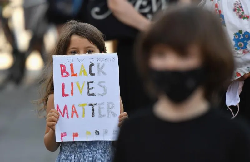 طفلة تشارك في الاحتجاجات بنيويورك حاملة شعار «حياة السود مهمة» (أ.ف.ب)