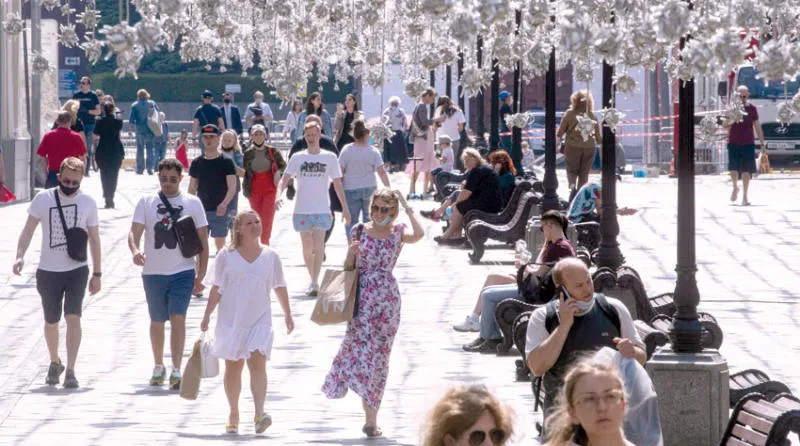 روس يسيرون في أحد شوارع موسكو أمس بعد رفع الإغلاق الاحترازي ضد فيروس «كورونا» (إ.ب.أ)