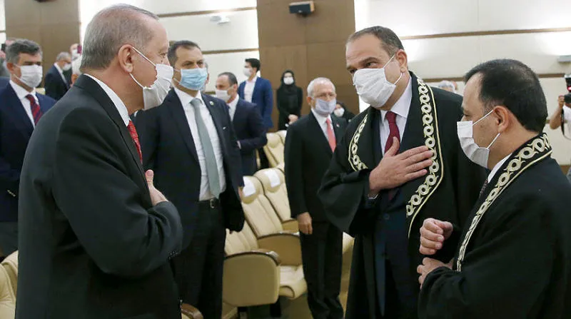 إردوغان خلال حفل تنصيب عضو جديد عيّنه في المحكمة الدستورية بأنقرة أمس (أ.ب)