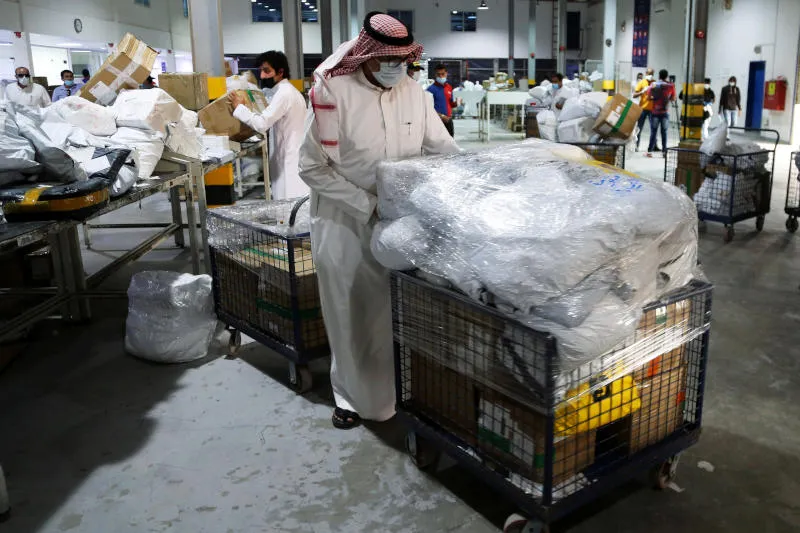رجل يرتدي كمامة في أحد مخازن السلع في الرياض (رويترز)