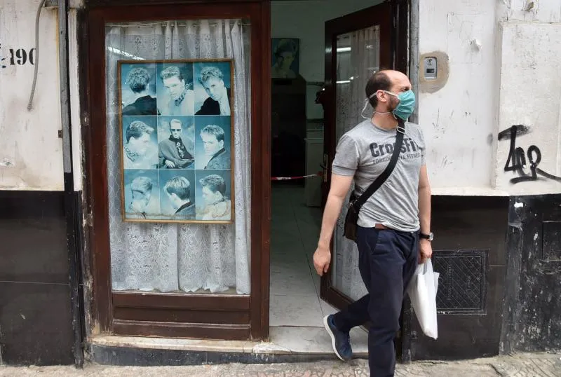 شاب يرتدي كمامة عند خروجه من محل للحلاقة في الجزائر (أ.ف.ب)
