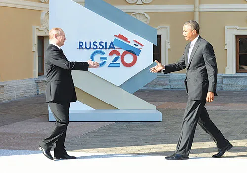 الرئيس الروسي فلاديمير بوتين لدى استقباله باراك أوباما في اجتماع قمة العشرين التي تستضيفها روسيا أمس (أ.ف.ب)