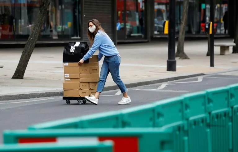عاملة في مجال البيع بالتجزئة تضع كمامة فيما تقوم بنقل صناديق بشارع أوكسفورد في لندن (أ.ف.ب)