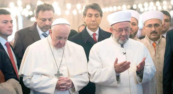 وصلى البابا فرنسيس في الجامع الأزرق بجوار مفتي إسطنبول رحمي ياران ليدلل على الوئام بين الديانات في الدولة المجاورة لسوريا والعراق، وأحنى رأسه متمتما بالصلوات لبضع دقائق، فيما وصفه المتحدث باسم الفاتيكان بلحظة «تضرع صامتة للرب». وكان تصرف مماثل لسلفه البابا بنديكتوس قد أثار في سنة 2006 انتقادات من الكاثوليك المحافظين، ومن بعض المسلمين أيضا. وراقب المئات، ومن بينهم سياح أجانب من خلف حواجز وضعتها الشرطة، البابا وهو يسير إلى متحف آيا صوفيا القريب. ولوحت مجموعة من أطفال المدارس بأعلام تركيا والفاتيكان، وهتفوا: «يحيا البابا فرنسيس» باللغة الإيطالية.