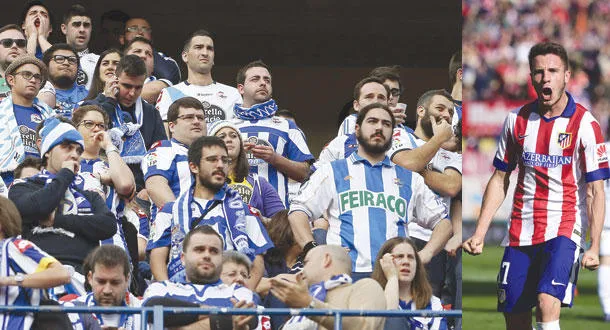 نوغيز لاعب اتلتيكو يحتفل بهدفه في مرمى لاكورنيا (ا ف ب) - الحزن يخيم على مشجعي لاكورنيا وهم يتابعون اللقاء (إ.ب.أ)