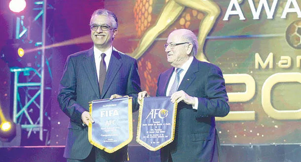 بلاتر وإلى جانبه الشيخ سلمان بن إبراهيم خلال حفل تسليم جوائز الاتحاد الآسيوي أمس