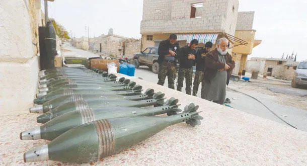 مقاتلون في الجيش الحر يصلّون بالقرب من قذائف مورتر على جبهة حندرات، قرب حلب (رويترز)