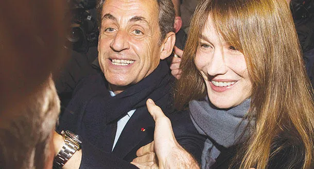 نيكولا ساركوزي وزوجته كارلا بروني بعد الإعلان عن فوزه برئاسة حزبه مساء أول من أمس (إ.ب.أ)