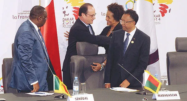 الرئيس الفرنسي هولاند يهنئ الكندية ميشيل جان بعد اختيارها أمينة عامة للمجموعة الفرنكفونية في دكار أمس (أ.ف.ب)