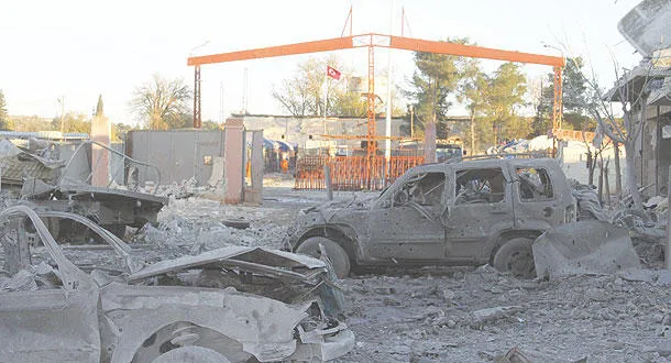 سيارات دمرها تفجير انتحاري من «داعش» على معبر تركي ـــ سوري أول أمس (أ. ف. ب)