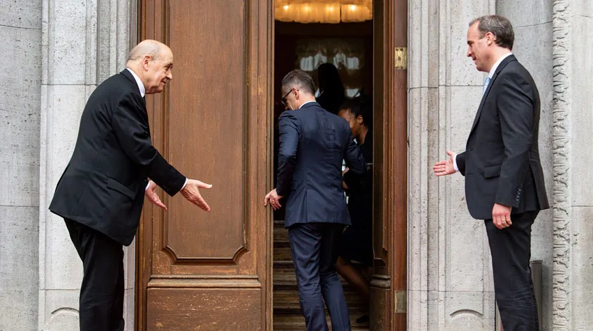وزيري خارجية فرنسا وبريطانيا في مجاملة قبل الدخول إلى مفاوضات، ويسبقهما وزير الخارجية الألماني في برلين أمس (د.ب.أ)
