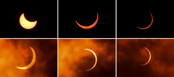 مراحل الكسوف الحلقي الشمسي كما يظهر من خلال السحب من نيودلهي (أ.ف.ب)