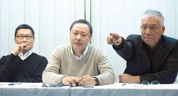 قادة الحركة الاحتجاجية أثناء إعلان عزمهم على تسليم أنفسهم للشرطة في هونغ كونغ أمس (أ.ف.ب)