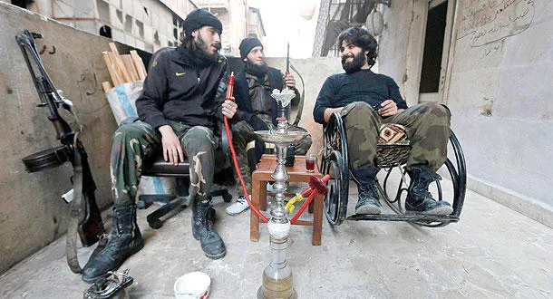 مقاتلون من «جيش المجاهدين» المحسوب على الجيش السوري الحر في استراحة عند حاجز زينو بحلب (رويترز)