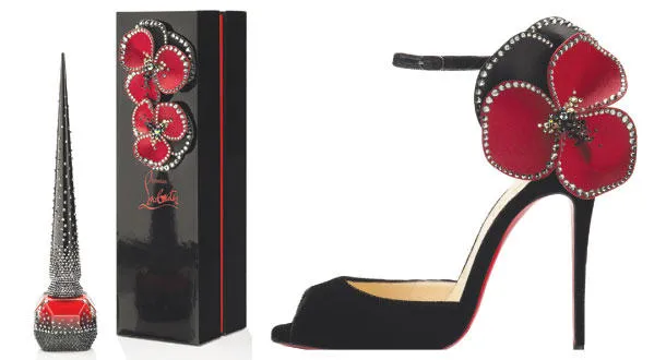 حذاء «بونس أموا» الذي ألهم طلاء الأظافر - علبة طلاء الأظافر الأحمر من اللكر الأسود وزهرتان مرصعتان بالأحجار