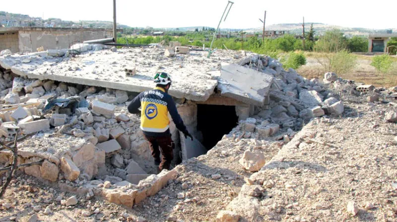 عنصر من الدفاع المدني قرب مبنى مدمر في ريف ادلب (الائتلاف السوري)
