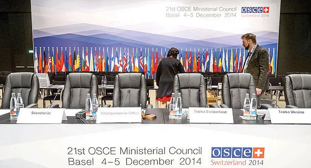 مساعدان يرتبان قاعة الاجتماعات أمس عشية اللقاء الوزاري لمنظمة الأمن والتعاون في أوروبا المرتقب عقده في مدينة بازل السويسرية اليوم (ا.ف.ب)