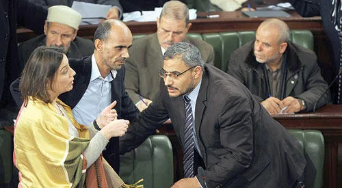 سياسيون من أحزاب تونسية مختلفة في حديث جانبي على هتمش جلسة في الجمعية الوطنية التأسيسية أمس (أ.ف.ب)