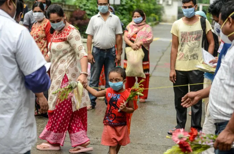 طاقم صحي هندي يوزع شهادات وورود لمتعافين من «كوفيد - 19» في سيليغوري الأربعاء (أ.ف.ب)